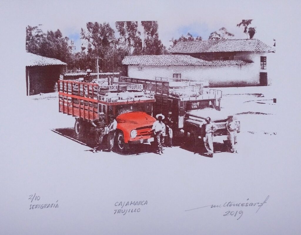 Milton Bautista, llega desde la geografía norteña, a 16 horas en bus, hasta este centro que gobierna el país; viene trayendo imágenes de las primeras versiones del transporte interprovincial, el transporte mixto, pasajeros por un lado y animales por el otro; la imagen, de una serigrafía titulada “Cajamarca Trujillo” rememora las vicisitudes de los viajes, las carreteras que se iban abriendo entre los andes y la arena, la cantidad excesiva de horas para trasladarse entre lugar y lugar, proezas de conductores que se conectaban a la tecnología y aprendían a convivir y dominarla, a adecuarla a sus necesidades, a reparar las fallas mecánicas sin entender las instrucciones en inglés o sin saber leer ni escribir, camiones que recorrían de Cajamarca a Trujillo y viceversa.