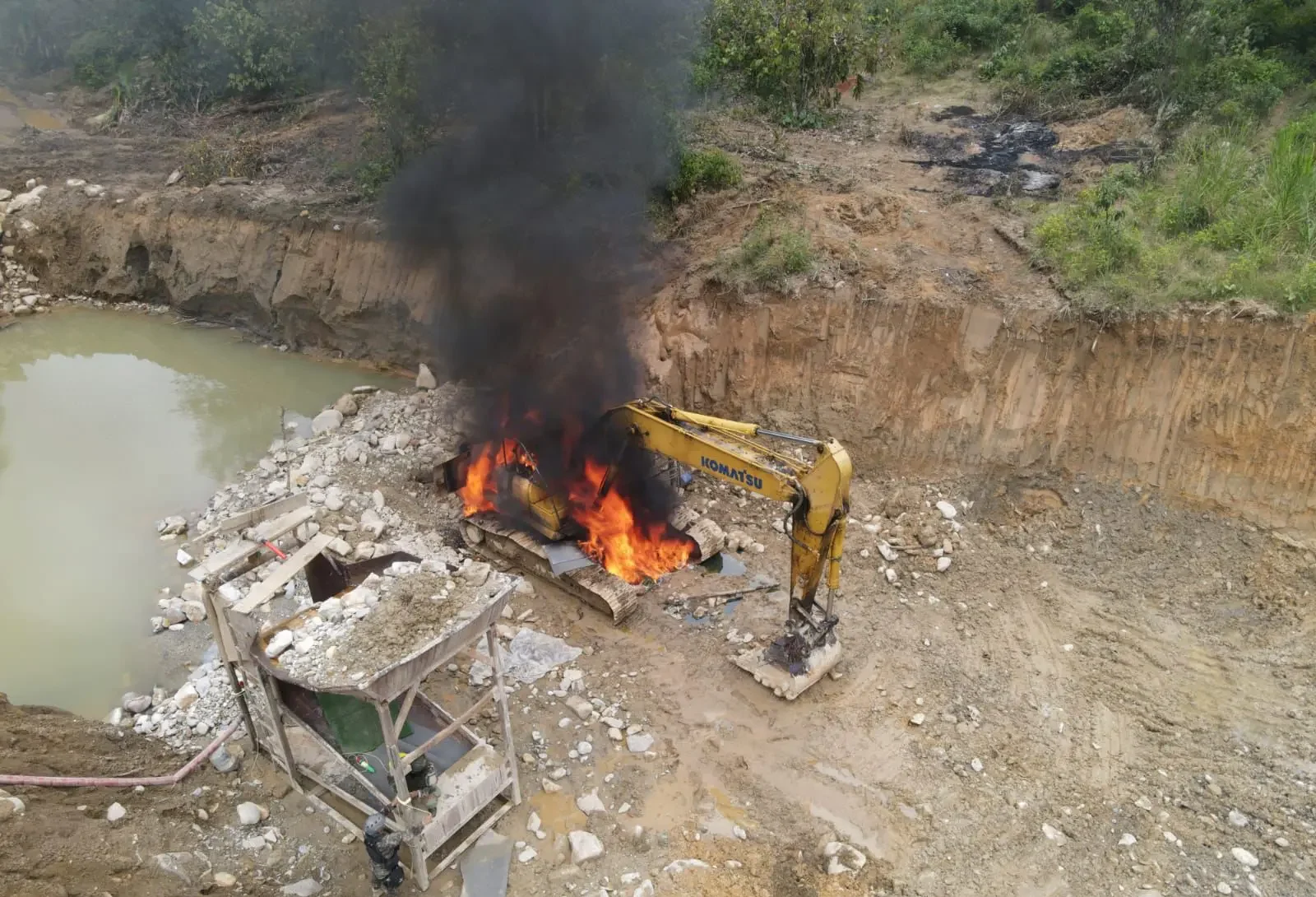 La Policía Nacional indicó que la presencia de maquinaria pesada en la zona confirmaría la magnitud de la actividad ilícita desarrollada en el lugar. Según precisó la institución, la retroexcavadora hidráulica encontrada corresponde a la marca Komatsu, modelo PC220LC-8, y se encontraba operativa al momento de la intervención.