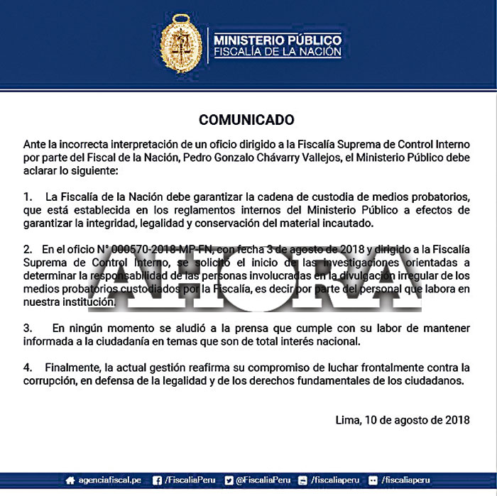 La información trascendió mediante un comunicado divulgado por el Ministerio Público en el que se detalla, en el primer punto, que los audios difundidos deberán ser “garantizados bajo la cadena de custodia de medios probatorios establecida en los reglamentos internos del Ministerio Público”, es decir, se elaborará un documento que garantice la autenticidad, seguridad, preservación e integridad de la evidencia física hallada, obtenida o examinada.