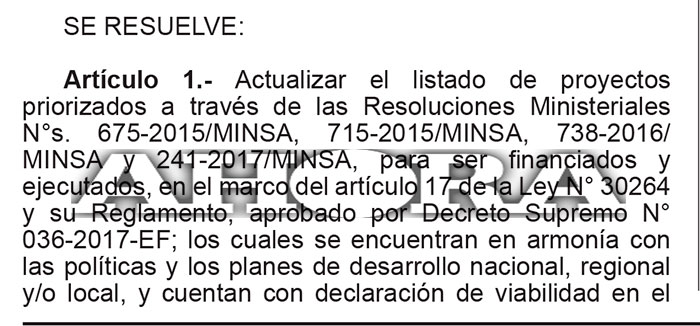 Mediante la Resolución Ministerial n.° 830-2018/Minsa, firmado por la ministra de Salud, Silvia Ester Pessah Eljay, publicado ayer en el diario El Peruano, se ha dado el visto bueno final para el financiamiento del proyecto “Mejoramiento y ampliación de los servicios de salud del centro de salud de Jesús”. Así lo informó el alcalde Napoleón Carlos Huamán. De esa manera se obtiene autorización para el financiamiento en la modalidad Obras por Impuestos, del proyecto de un moderno establecimiento de salud que será de gran utilidad para toda la provincia y poblaciones aledañas.