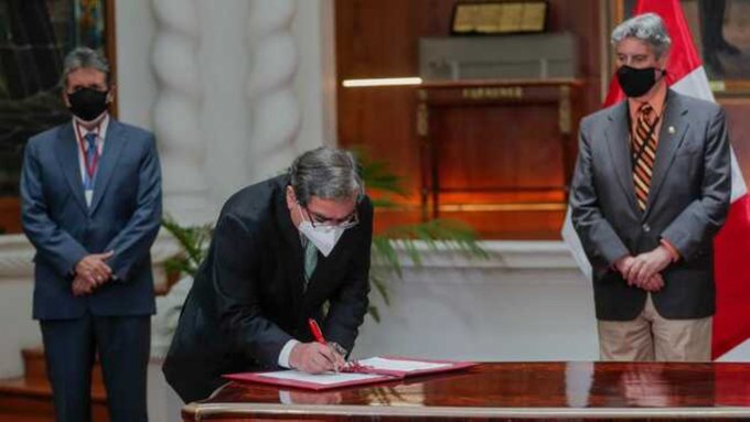 El oxígeno medicinal se importará desde Chile en un plazo total de seis meses y fue firmado por Oscar Ugarte, ministro de Salud, Raúl Jacob Ruisánchez, vicepresidente de Finanzas de Southern, Víctor Gobitz, gerente general de Antamina, Julia Torreblanca, vicepresidenta de Asuntos Corporativos de Cerro Verde, y Pablo De La Flor, gerente general de la SNMPE.