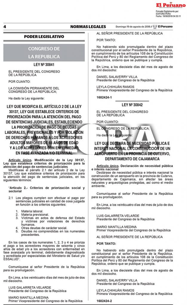 Se ha modificado la normatividad para el pago de la deuda social que mantiene el Estado peruano con los trabajadores, cesantes y jubilados, según lo ordena la Ley N° 30841 “Ley que modifica el artículo 2 de la Ley 30137, que establece criterios de priorización para la atención del pago de sentencias judiciales, estableciendo la priorización de pago de deudas