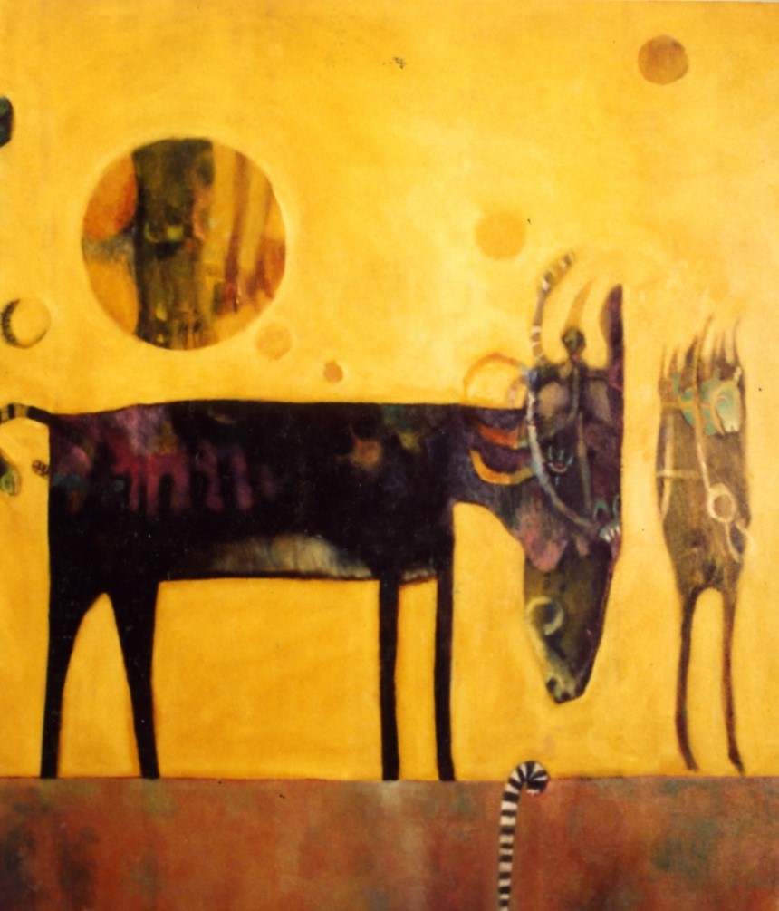 Admiro a Di Giovanni, mucho antes que a Basquiat, con seis años menor que éste, el proceso de formar su panteón de criaturas, una más original que otra no ha cesado; recuerdo esa formidable obra titulada “The Mula”, la grafía y la manera de resolver aquella pintura, no la había visto en ningún artista local. Terminaron los noventas y Basquiat entró a ser parte de las influencias juveniles y una buena porción de artistas talentosos sucumbieron al canto del sireno.