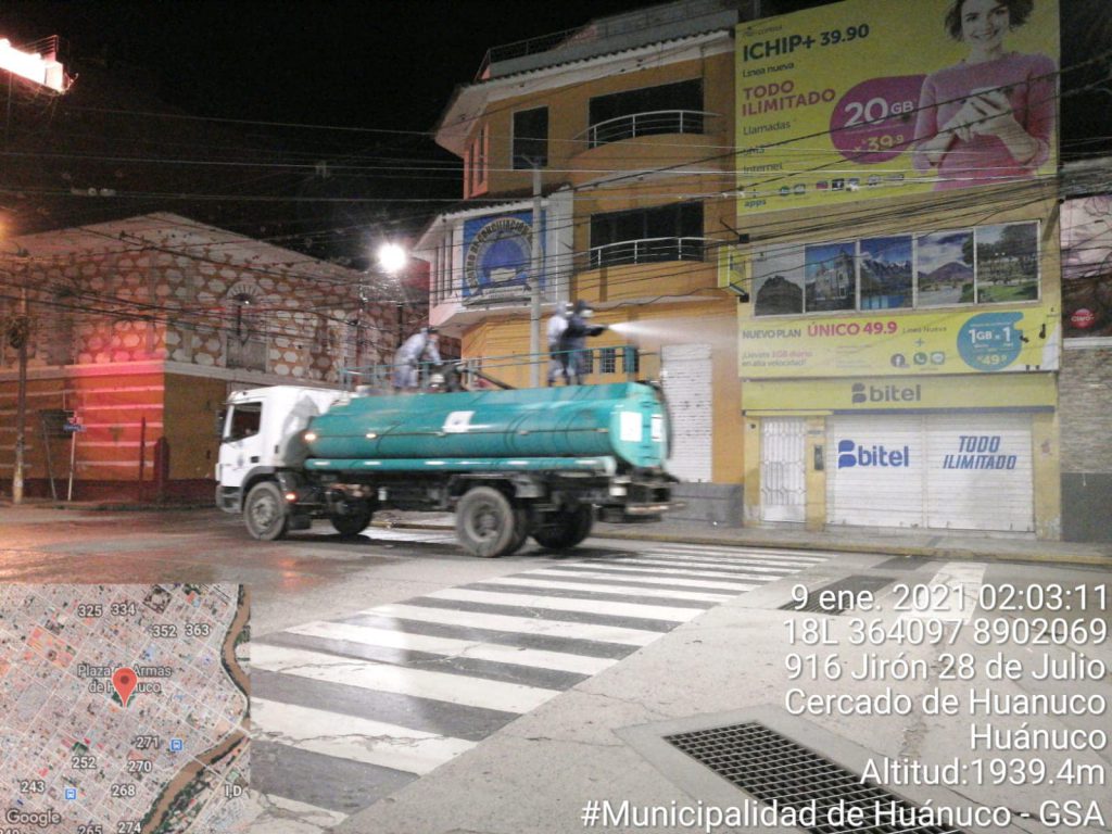 Durante la madrugada de este sábado, el equipo de limpieza de la Municipalidad Provincial de Huánuco se desplegó por las principales calles de la ciudad para realizar trabajos de desinfección preventivos al COVID-19.