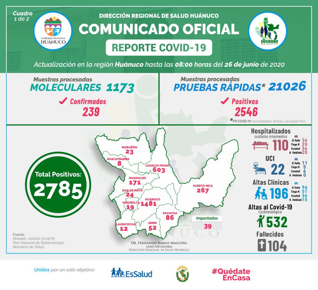 La información oficial de este viernes 26 mostró un total de 2785 contagios desde que comenzó la cuarentena en el departamento; de esta cantidad, 1481 se ubicaron en Huánuco y 603 en Leoncio Prado.