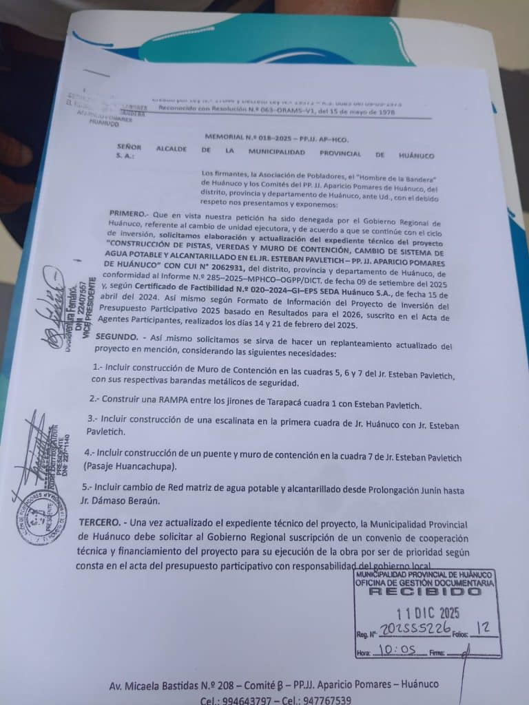 En medio de un clima de creciente malestar vecinal, Buenaventura Fernández Atavillos, presidente del Comité 11 de Aparicio Pomares, denunció que la municipalidad mantiene casi un año de demora en la actualización del expediente técnico para la ejecución de obras de pistas y veredas en el jirón Esteban Pavletich, así como el saneamiento básico y cambio de alcantarillado en Micaela Bastidas. Señaló que la población ha esperado avances concretos desde que estos proyectos fueron aprobados en el proceso de presupuesto participativo desarrollado entre el 14 y 21 de febrero de 2025, sin que hasta el momento se materialice la actualización técnica necesaria para continuar con el procedimiento.