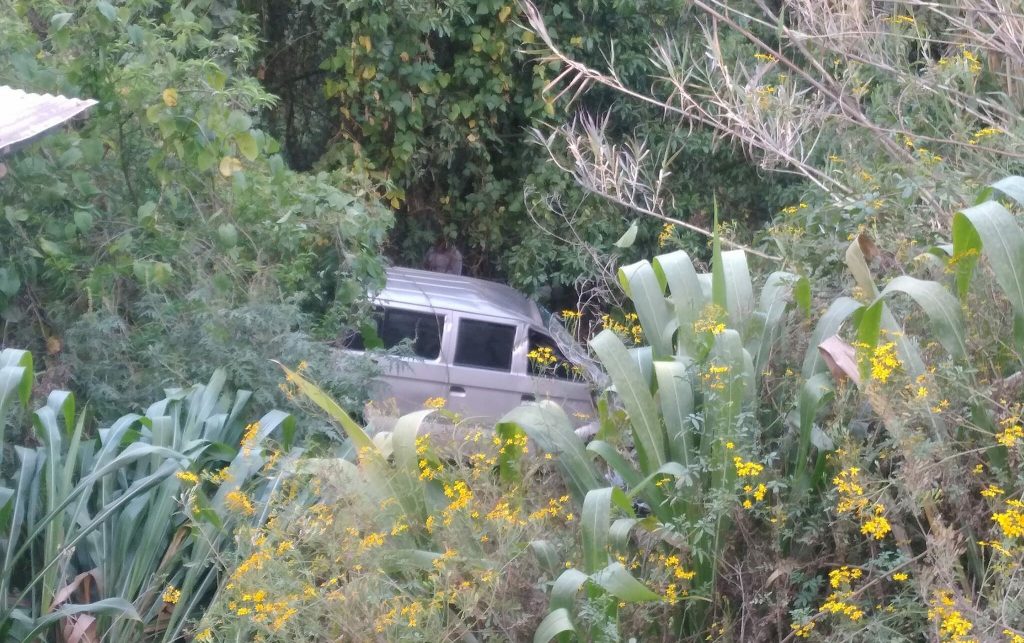 Pasajeros de un vehículo minivan de color plateado pasaron el susto de sus vidas, luego que el carro se precipitara por una pendiente. Sin embargo, afortunadamente, nadie sufrió lesiones graves.