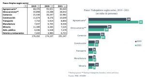 Entre 2019 y 2021, la población ocupada en Pasco pasó de 162 mil trabajadores a 177 mil, superando su nivel prepandemia en 9 %. Sin embargo, este crecimiento se vio impulsado principalmente por el agro –sector conformado casi en su totalidad por trabajadores informales- que pasó de concentrar el 39 % del empleo total en 2019 al 47 % en 2021. En contraste, disminuyó la participación de sectores más productivos como construcción (de 7 % a 6 %), minería (de 6 % a 4 %) y servicios (de 19 % a 15 %).