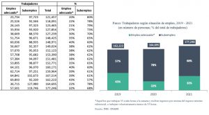 Si bien la cantidad de empleos en Pasco ha aumentado, la calidad de estos se ha deteriorado. La tasa de subempleo pasó de 57 % en 2019 a 68 % en 2021. Es decir, 2 de cada 3 trabajadores pasqueños trabaja más de 35 horas a la semana y recibe ingresos por debajo del ingreso mínimo referencial determinado por el INEI, o trabaja menos de 35 horas semanales pese a que desea trabajar más. El deterioro del mercado laboral también se evidencia en el incremento de la informalidad laboral. El porcentaje de empleos informales aumentó de 78 % en 2019 a 85 % en 2021, muy por encima del promedio nacional (77 %).