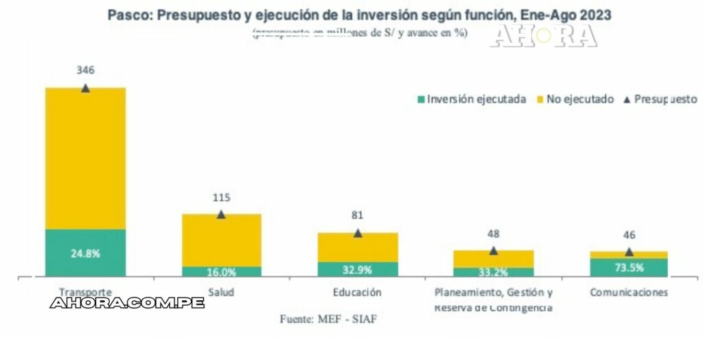 Las cinco funciones con los mayores presupuestos de inversión pública en Pasco son transporte (S/ 346.3 millones), salud (S/ 114.6 millones), educación (S/ 81.3 millones), planeamiento, gestión y reserva de contingencia (S/ 48.2 millones) y comunicaciones (S/ 45.7 millones). Pese a la importancia de estos sectores, ninguno supera un avance de 40% a agosto de 2023, salvo el de comunicaciones.
