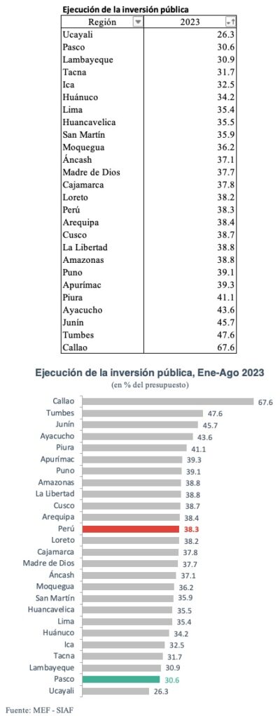 Al cierre de agosto del 2023, Pasco ha ejecutado solo el 30.6% de su presupuesto de inversión, equivalente a una inversión de S/ 240 millones en los primeros ocho meses del año. Esto significa que aún quedan S/ 545 millones por ejecutar en lo que resta del año. El porcentaje de ejecución de Pasco está muy por debajo del promedio nacional de 38.3% y la sitúa como la segunda región con menor avance de la inversión pública, solo por encima de Ucayali (26.3%).