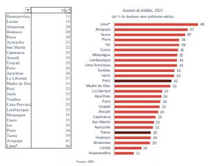 De esta manera, la región se mantuvo como la quinta con menor acceso al crédito a nivel nacional, muy similar a Huánuco (20.3 %) y ligeramente por debajo de Ayacucho (21.5 %).