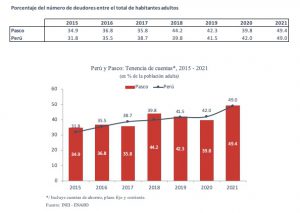 En Perú, el acceso al crédito -medido como el porcentaje de deudores entre la población adulta- disminuyó de 35.0 % a 31.7 % entre 2019 y 2021. En Pasco, este indicador cayó de 22.6 % a 20.3 %.