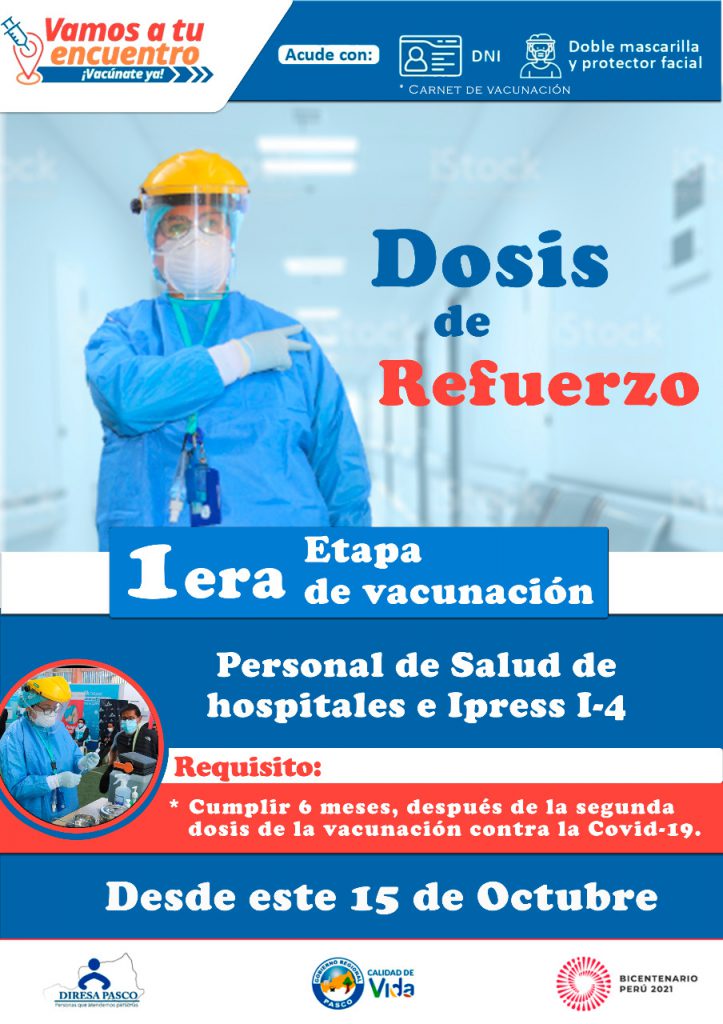 Un total de dos mil 651 profesionales de la salud de la región Pasco recibirán la tercera dosis de la vacuna contra la COVID-19. Este proceso de inmunización al personal sanitario de primera línea de hospitales e IPRESS del nivel I4 en la región Pasco. Fue anunciado por el titular de la Dirección Regional de Salud (Diresa), Paúl Luis Mayorca Olivera.