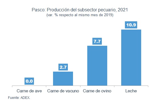 Durante el 2021, la producción agropecuaria en Pasco se expandió 25.0% respecto al 2019 y 23.0% respecto al 2020. Así, el único mes del 2021 donde la actividad agropecuaria de la región no superó los niveles del 2019 fue marzo (-3.3%). El crecimiento del sector se explica por el aumento de la producción orientada al sector interno y externo, junto al incremento de la producción pecuaria.