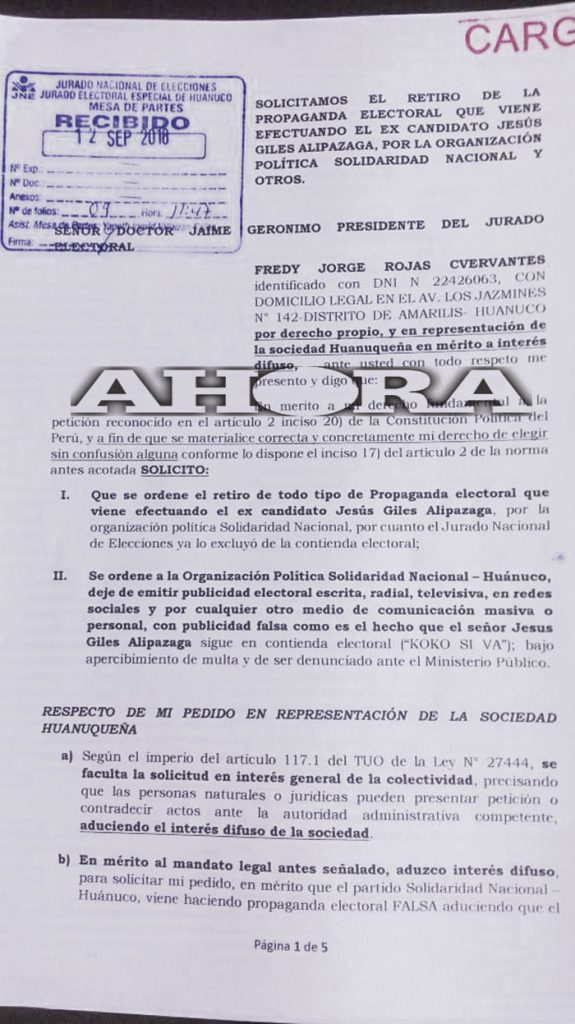 El conocido abogado Fredy Rojas Cervantes, con DNI 22426063 y domiciliado en el distrito de Amarilis, ha solicitado al Jurado Electoral Especial de Huánuco que ordene el retiro de la propaganda electoral del excandidato Jesús Giles Alipázaga por el partido político Solidaridad Nacional, al haber dispuesto el Jurado Nacional de Elecciones su exclusión por tener vigente una sentencia judicial que lo inhabilita para ser candidato; en segundo lugar, solicita que se ordene al partido Solidaridad Nacional que deje de emitir publicidad electoral escrita, radial, televisiva, en redes sociales y por cualquier otro medio de comunicación masiva o personal, publicidad falsa como la de afirmar que Jesús Giles sigue en la contienda electoral, bajo apercibimiento de multa y de ser denunciado ante el Ministerio Público.