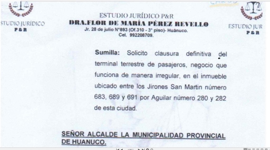 En el documento afirma que el inmueble de 600 metros cuadrados es administrado de manera ilegal e irregular por Moisés Edmundo Pablo Chaupis y lo alquila para ser usado como terminal de carga y descarga de mercancías y pasajeros que viajan o llegan a la ciudad de Huánuco de las zonas de La Unión, Huamalíes, Lauricocha, entre otros.