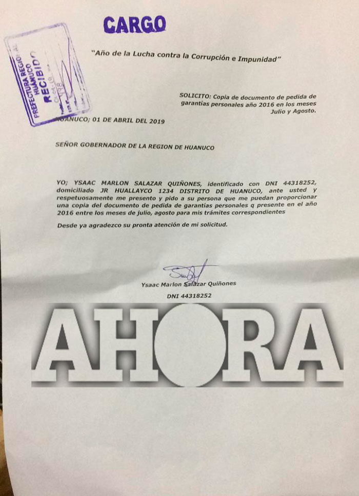 El ciudadano Marlon Salazar Quiñones, denunció que en las oficinas de la Prefectura perdieron su Documento Nacional de Identidad, que presentó pidiendo garantías personales por una amenaza en su contra.