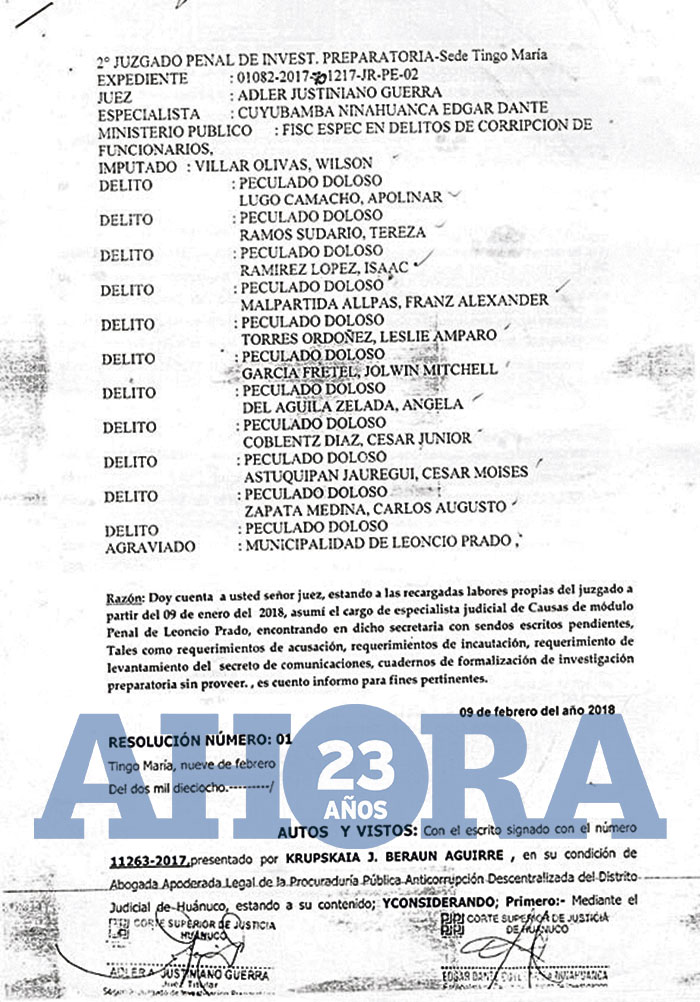 Hasta la fecha, el Segundo Juzgado Penal de Investigación Preparatoria, a cargo del juez Adler Justiniano Guerra, no se ha pronunciado por los supuestos hechos de corrupción en los que se encuentran involucrados 11 funcionarios de la Municipalidad Provincial, incluyendo al alcalde Carlos Augusto Zapata Medina, denunciados por peculado doloso, según el expediente 01082-2017-701217-JR-PE-02.
