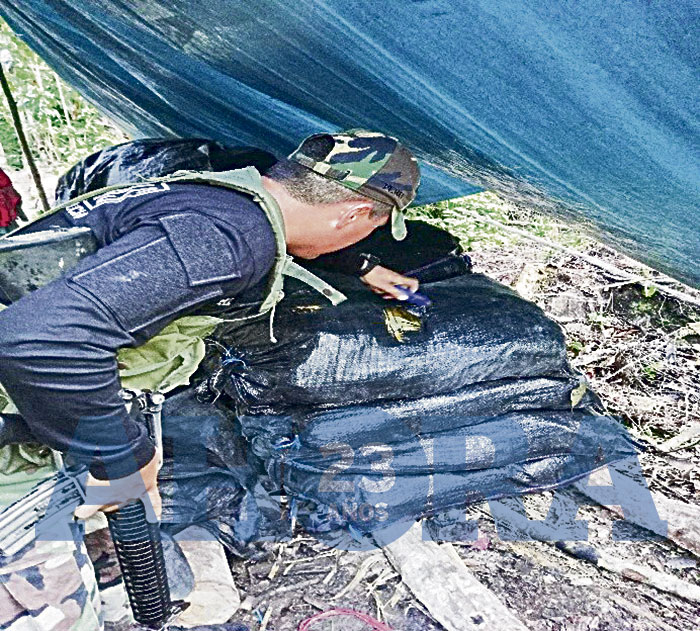 En una trocha carrozable, en un centro de acopio construido rústicamente con palos y plásticos, se halló 38 costales negros que contenían la cal, que al pesarlo arrojó la cantidad arriba indicada. También halló 151.200 kilos de hidrocarburos derivados del petróleo y 3 kilos de ácido muriático.