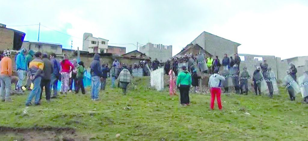 Un grupo de invasores de terrenos de la parte alta el barrio Loropuquio, en el distrito de Chaupimarca, fue desalojado por un fuerte contingente policial. No se registraron daños personales y los agentes retiraron las carpas y plásticos que habían instalado en el lugar.