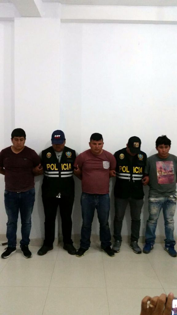 Los policías de civil detuvieron a José Javier Paredes Cartagena (33), alias “Lechera”, Oscar Henrry Lobatón Guevara (25), Javier Raúl Echegoyen Valerio (26) y Gina Rosmery Flores Reyes (21), mientras que las dos mujeres, una de ellas identificada como Mishell, lograron darse a la fuga.