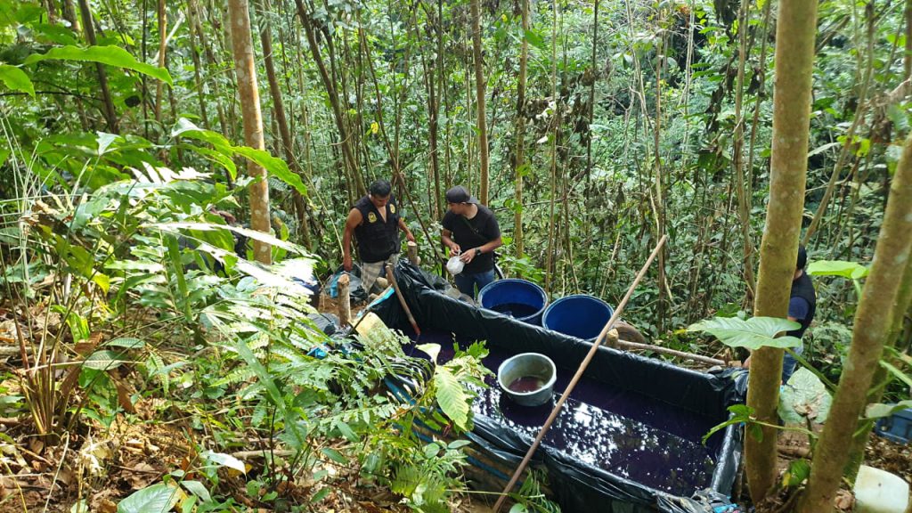 Policías del Escuadrón Verde del grupo Terna hallaron cuatro pozas de maceración de hojas de coca con gran cantidad de alcaloides de cocaína líquida, en el caserío de Alto Sangapilla en el distrito de Aucayacu – Huánuco.