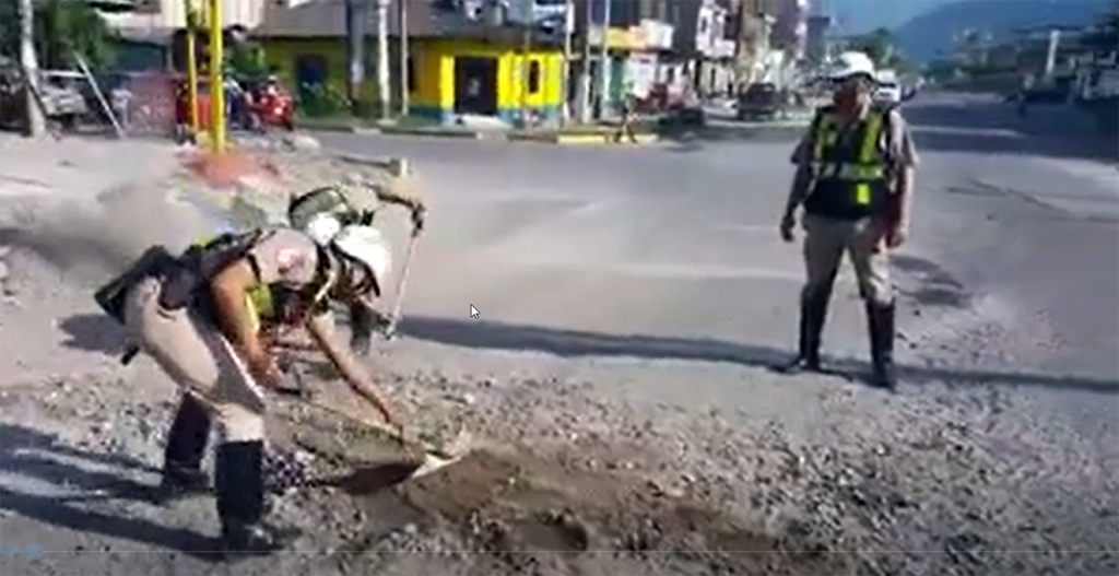 En un hecho no muy común y que llamó la atención de transeúntes y transportistas, policías de la División de Tránsito de Tingo María, con palas en mano retiraron montículos de tierra que obstaculizaban el tránsito en la calle Julio Burga y avenida Raymondi.