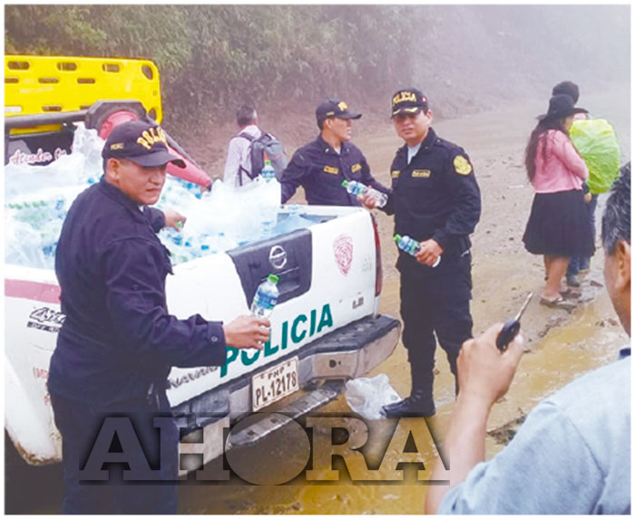 En horas de la mañana de ayer, un grupo de efectivos de la PNP de las comisarías de Tingo maría, Cayumba, Pumahuasi y Tulumayo, se desplazaron hasta la zona donde se produjeron los huaicos para entregar agua y otros alimenticios.