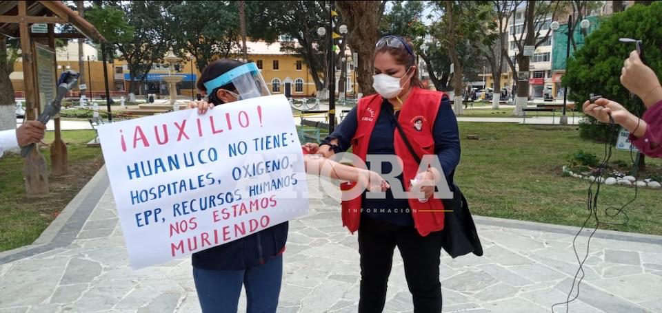 Las trabajadores realizaron la protesta en la Plaza Mayor de Huánuco, exigiendo que el que el estado atienda a Huánuco para evitar mayor contagio y más tragedias como la pérdida de vidas humanas.