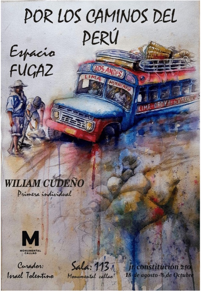 Hay algo significativo en esta exposición, a Wiliam Cudeño (Huánuco, 1985) lo conozco desde el 2002, ambos coincidimos en el colegio Pillko Marka, en una temporada donde yo era un joven profesor de arte y él un adolescente en busca de su profesión. Momento de encuentro donde las recomendaciones de un novato docente se circunscribían al contexto político y económico del país (dadas las circunstancias, mis recomendaciones hoy día siguen siendo las mismas) poco halagüeñas para decidirse al Arte en general, pero como suceden en las historias dignas de contarse, Wiliam no me hizo caso completamente, es decir, a la búsqueda de un trabajo estable económicamente, sumó su vocación hacia la pintura como técnica y las imágenes como una manera de paliar su desarraigo.