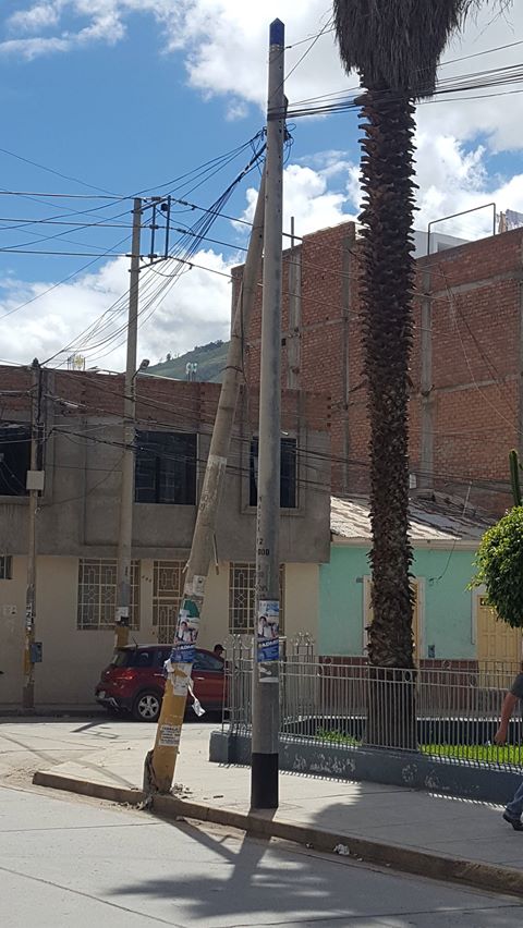 Los Vecinos de los jirones 2 de Mayo y Junin reportan que viven en constante miedo por la posible caída de un poste.