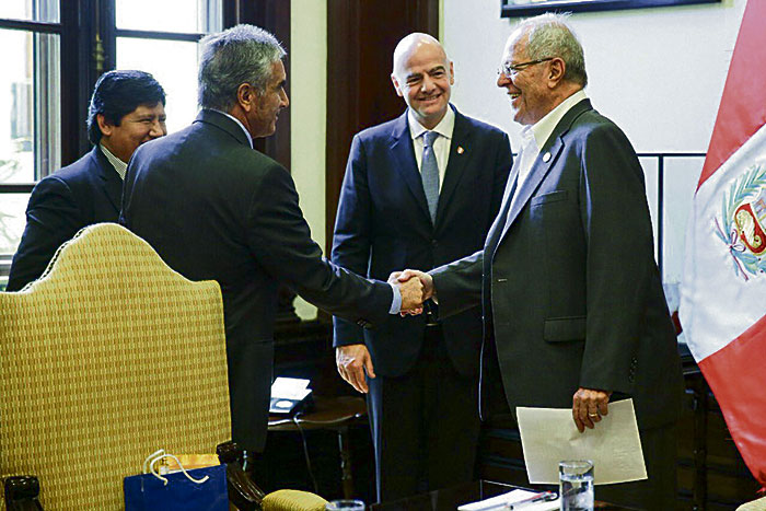 El presidente de la República, Pedro Pablo Kuczynski, recibió a Gianni Infantino en Palacio de Gobierno, donde dialogaron sobre la promoción del deporte emprendida por el gobierno peruano para alejar a los jóvenes del pandillaje.