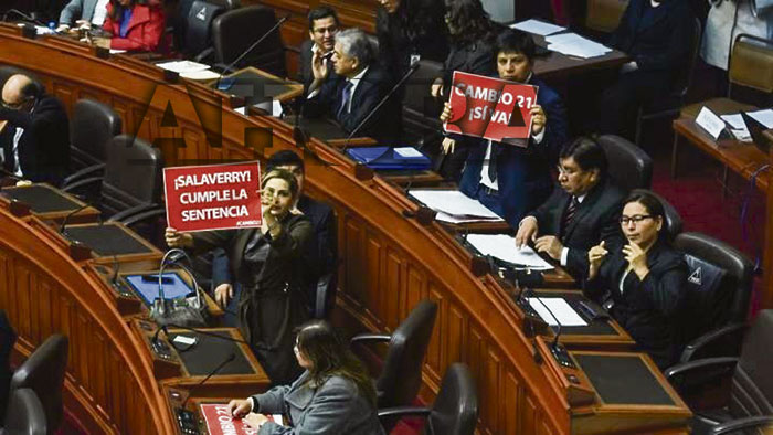 De esta manera, los parlamentarios Maritza García y Marvín Palma mostraron carteles con mensajes como «Salaverry, cumple la sentencia» o «Cambio 21 sí va», en alusión al nombre que tendría la nueva bancada conformada por los renunciantes allegados al suspendido Kenji Fujimori.