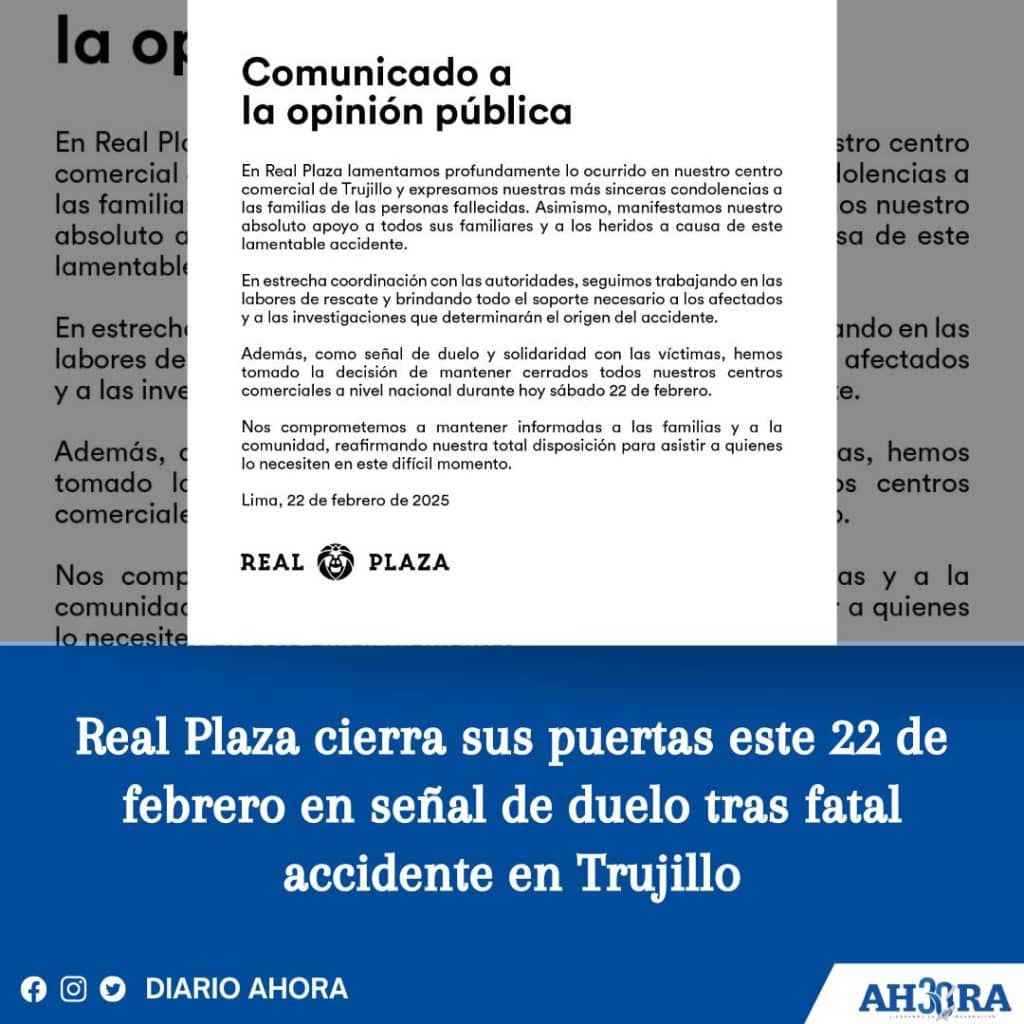 Asimismo, Real Plaza destacó que se encuentra colaborando con las autoridades para esclarecer las causas del colapso y brindar asistencia a los heridos. “Como señal de duelo y solidaridad con las víctimas, hemos tomado la decisión de mantener cerrados todos nuestros centros comerciales a nivel nacional durante hoy sábado 22 de febrero”, agregó en el documento. Según Por Redacción EC para El Comercio.