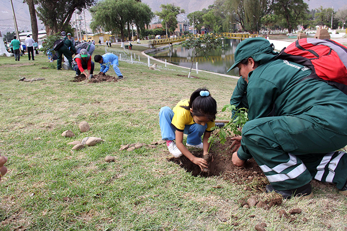 Niños de diferentes instituciones educativas sembraron árboles en los alrededores de la laguna Viña del Río en la campaña de reforestación, que realizó el Municipio de Huánuco, EsSalud entre otras organizaciones, por el día del Medio Ambiente que se celebra el 5 de junio.
