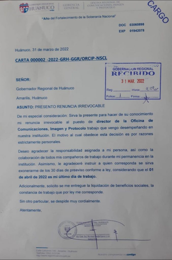 Con carta dirigida al gobernador regional, Cueva León, presentó su renuncia irrevocable pidiendo exoneración de los 30 días previos de aviso por Ley para una renuncia; además, pidió su liquidación de beneficios sociales y su certificado de trabajo.