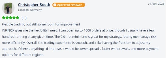 Algunos clientes de INFINOX expresan frustración respecto a aspectos que están afectados por regulaciones externas. En particular, puede tratarse del tiempo de procesamiento de los retiros, el cual está determinado por los estándares de la industria. Sin embargo, la mayoría de los clientes coinciden en destacar la utilidad de la solución de trading social y de otros beneficios adicionales.