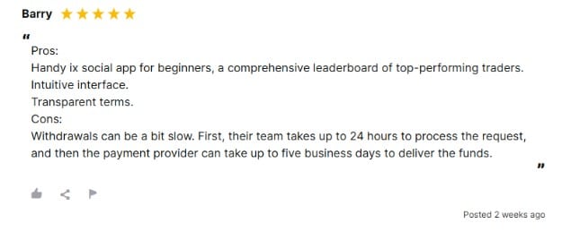 Esta solución de INFINOX recibe numerosos elogios. Ambos tipos de usuarios informan de una situación beneficiosa para todos, siempre que actúen con responsabilidad. Los seguidores deben investigar a fondo las ofertas y elegir al experto cuya estrategia realmente se adapte a sus necesidades, y ser pacientes, ya que las pérdidas temporales son inevitables. Los líderes deben generar más ganancias que pérdidas para conservar su audiencia y mantener la comunicación con ella; IX Social permite a ambas partes compartir información en un formato de red social.