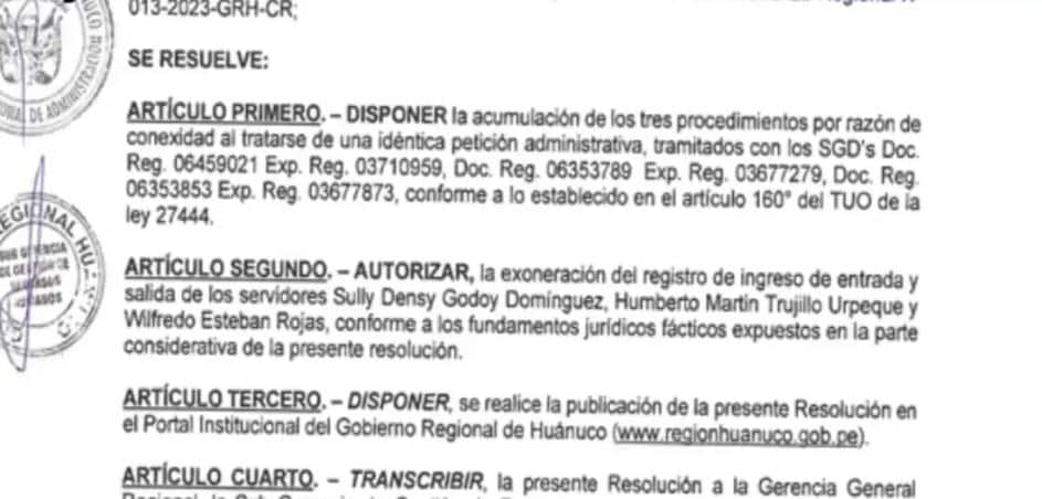 Una resolución emitida por la Gerencia General del Gobierno Regional de Huánuco (GOREHCO) ha generado críticas internas, al autorizar que tres trabajadores contratados bajo la modalidad CAS temporal queden exentos del registro obligatorio de ingreso y salida laboral. El documento, identificado como Resolución Gerencial General N.º 0379-2025-GRH-GGR y firmado por el gerente general Ronald Acuña, fue emitido el 31 de octubre de 2025 y ha sido cuestionado por supuestas preferencias dentro de la entidad.