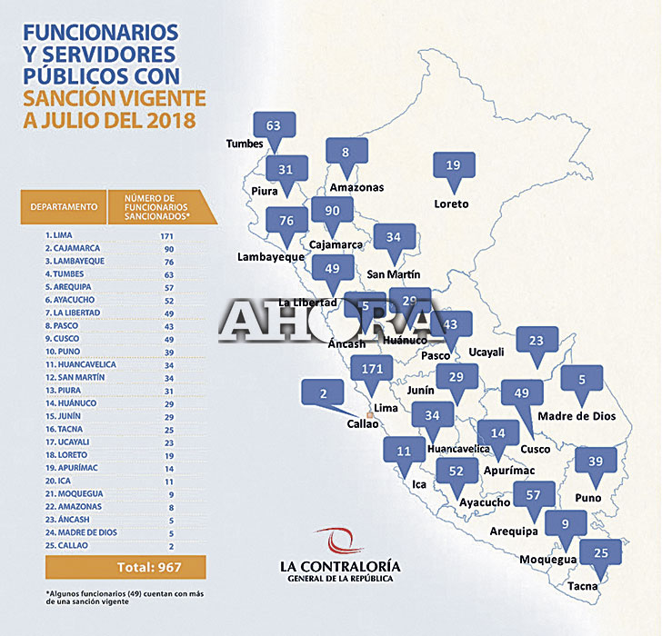 En el Perú existen 967 funcionarios y servidores públicos que se encuentran en esta situación y el departamento de Huánuco ocupa el 14° lugar con mayor número de sanciones que suman 31, lo que implica que algunos de los sancionados tienen más de una sanción.