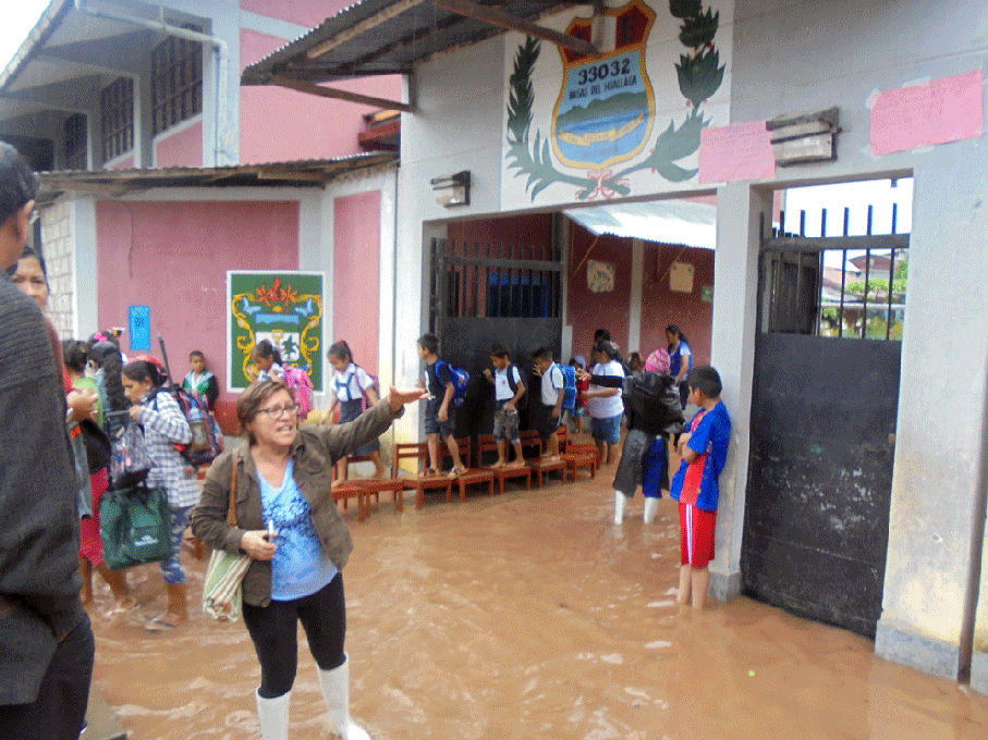 La UGEL Leoncio Prado, que se encuentra a 200 metros del local escolar, constató la situación y apoyó en la búsqueda de soluciones observando que los padres de familia tuvieron que cargar a sus hijos para evacuarlos porque la inundación de las aulas alcanzaba entre 40 a 50 cm de altura, lo que motivó que se colocara una fila de sillas por donde los niños caminaron para salir hasta el exterior del local. Constató que la fuerte lluvia producida desde horas de la madrugada fue la causa por la cual se incrementó el caudal de un riachuelo que colindan con el colegio y que se desbordó e inundó muy rápido la infraestructura.