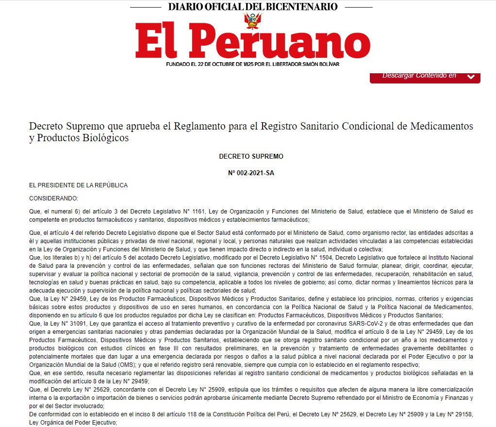 A través de la publicación que hizo el diario oficial “El Peruano”, señala que el Minsa aprobó el reglamento de la Ley N°31091 que permite el registro sanitario condicional por un año de las vacunas contra el coronavirus que ingresarán al país para ser aplicadas a la población.