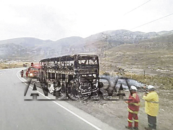 Más de 60 pasajeros se salvaron de morir luego que un ómnibus de la empresa de transportes León de Huánuco fuera consumido por el fuego la madrugada del miércoles en el sector de Cutt Off-Pachachaca, en el kilómetro 154 de la Carretera Central, en la provincia de Yauli, La Oroya.