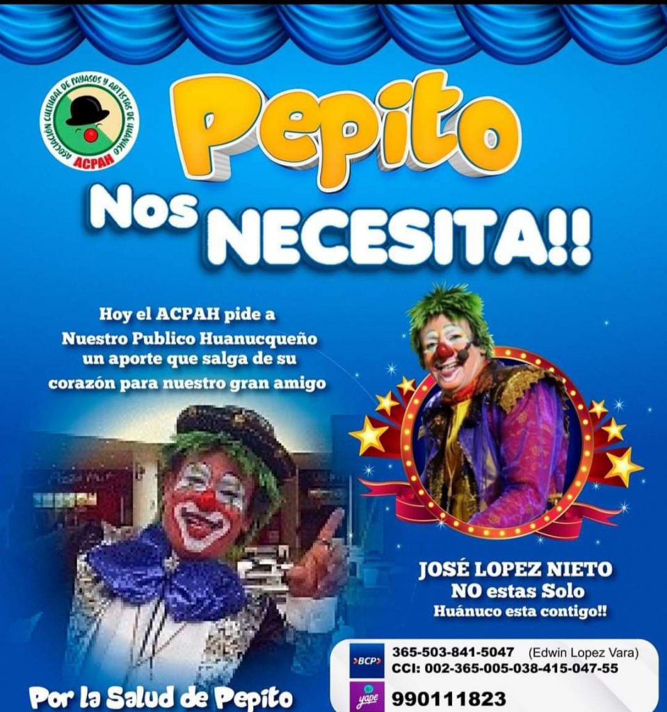 Pepito Show tiene 60 años de edad y se mantiene en las instalaciones del hospital EsSalud, cualquier aporte se puede realizar a la Cuenta BCP: 365-503-841-5047 a nombre de Edwin López Vara, Yape: 990111823.