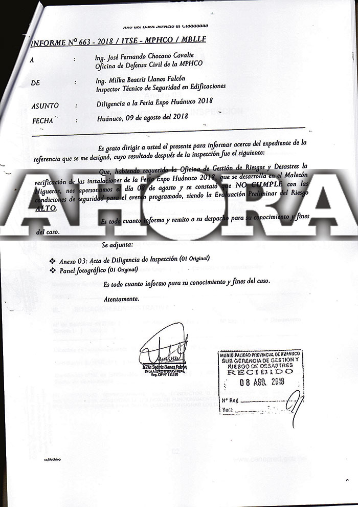 Posteriormente, el 30 de julio presentó el Informe n.º 1548, reiterando que la feria no cumplía las condiciones de seguridad, detallando que el 26 de julio visitó de manera preliminar la feria en proceso de implementación, donde planteó recomendaciones verbales; el domingo 29 de julio realizó una nueva inspección planteando diversas observaciones a los juegos mecánicos, a las uniones de los estand, a la totalidad de las estructuras metálicas que no se encuentran aterradas a pozos de tierra, carencia de extintores en los estand y extintores de acetato de potasio para los estand gastronómicos, falta de alumbrado de emergencia, escasas señales de rutas de evacuación y mantener abiertas las puertas laterales de la feria.
