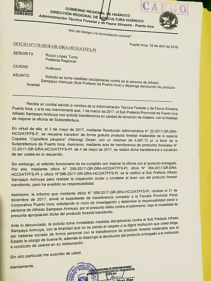 La Administración Técnico Forestal y de Fauna Silvestre de Puerto Inca (ATFFS), ha solicitado una investigación y severa sanción contra Alfredo Sampayo Arimuya, subprefecto de esa provincia a quien el 4 de mayo le entregó 4097.72 pies tablares de madera copaiba para la refacción de su local institucional, porque presuntamente se ha apropiado ilícitamente del producto, lo dio a conocer Jorge Mendoza Argomedo, jefe de la Defensoría de Tingo María. La denuncia fue recepcionada durante su visita a la provincia de Puerto Inca donde también tiene jurisdicción la oficina defensorial.