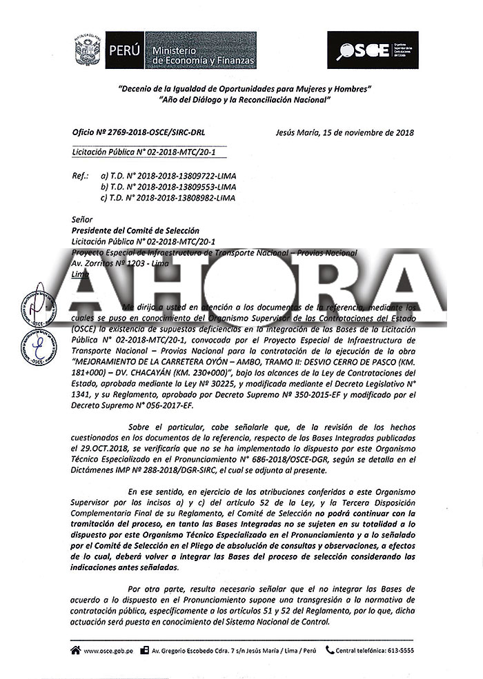 La suspensión de la licitación fue ordenada a Provías Nacional en víspera de darse la buena pro para conocer a la empresa ejecutora de la obra, mediante el oficio n.° 2769-2018-OSCE/SIRC-DRL del 15 de noviembre de 2018.