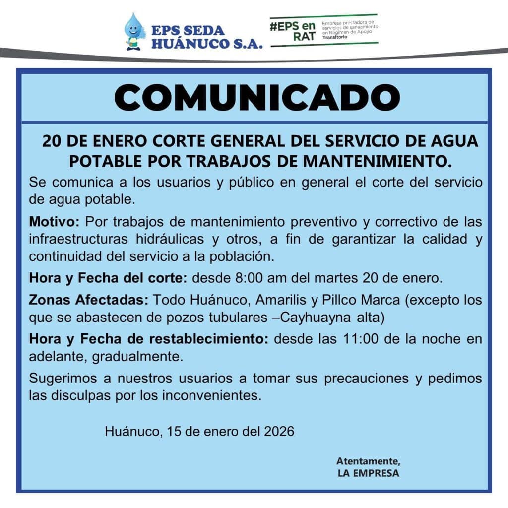 La EPS Seda Huánuco S.A. informó que hoy, martes 20 de enero, se ejecutará un corte general del servicio de…