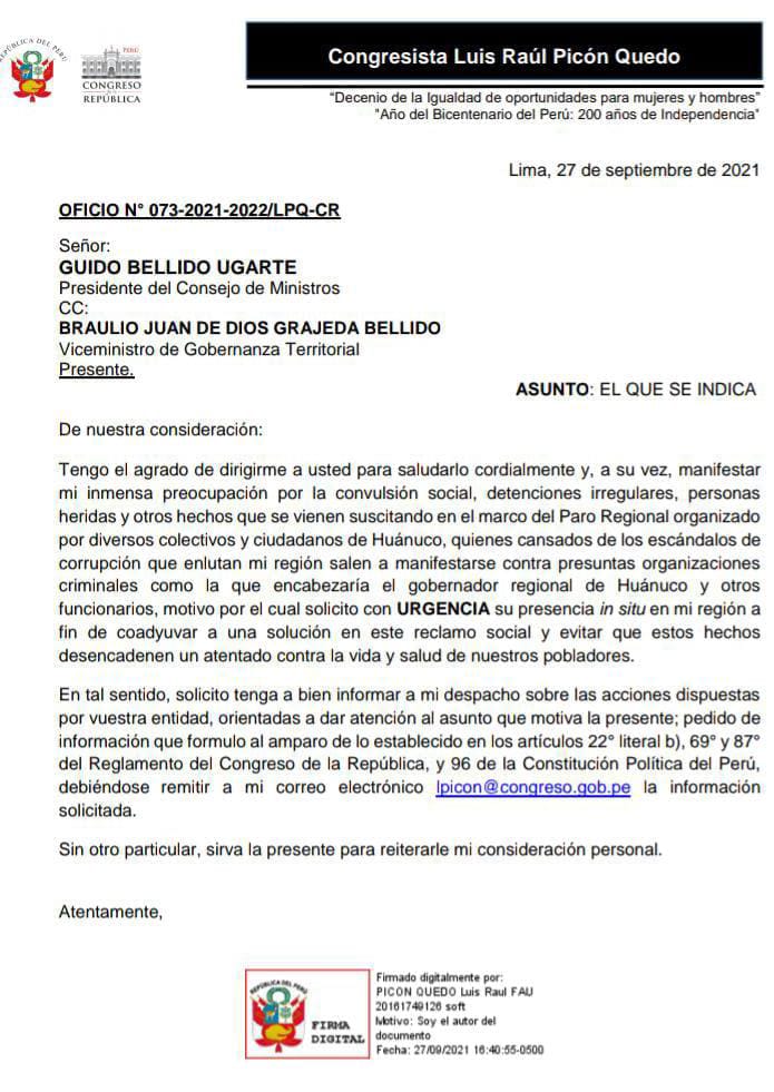 Solicitan presencia del premier Guido Bellido en la región Huánuco